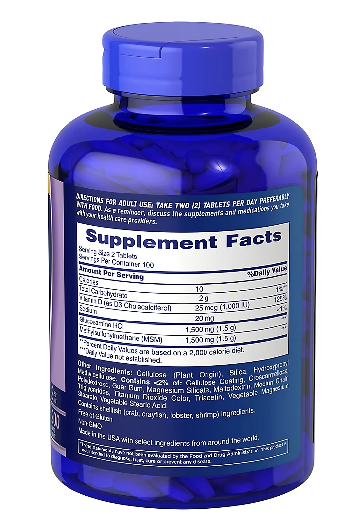 Ease arthritis pain with this dietary supplement that helps promote joint health and comfort within just 7 days of use. Each serving delivers 1,500mg of glucosamine, 1,500mg of MSM and 1,000 IU of vitamin D3. The coated caplets are easy to swallow.